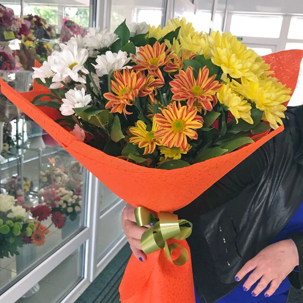 Трудно найти цветок, который был бы так же многогранен, как хризантема. Чарующая прелесть желтого, белого и оранжевого цветов в комбинации с зелеными веточками придется по душе солнечным, позитивным натурам. Хризантемы олицетворяют в букете восхищение и преданность. Такая дизайнерская композиция станет отличным поводом разделить торжество вместе с именинником, или лишний раз сказать маме, о том, как вы сильно ей дорожите.