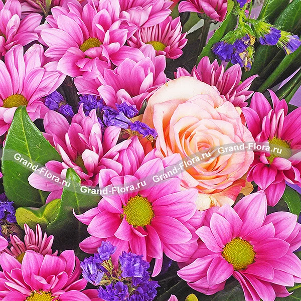 Хризантема кустовая фиолетовая - 15 шт., роза розовая - 11 шт., статица - 7 шт., салал,  фетр фиолетовый, бант.