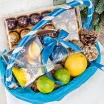 Стандартный(на фото): чай "Curtis"- 20 пак., конфеты "Ferrerro Roсher" - 269 г., лайм - 5 шт., лимон - 2 шт., шишки - 3 шт., шарики - 2 шт., корзина средняя.